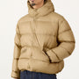 首元まで包み込む高めのフードと、裾のドローコードによって、防寒性とシルエットの調整も可能です。