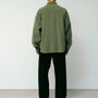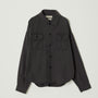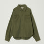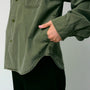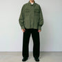 This model is a classic military shirt with a wide silhouette, a rounded hem design, and side pockets in the stomach area.