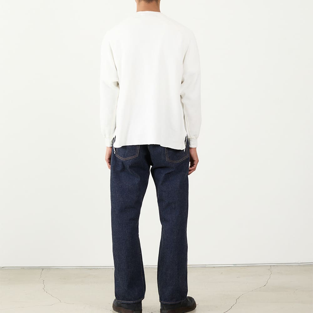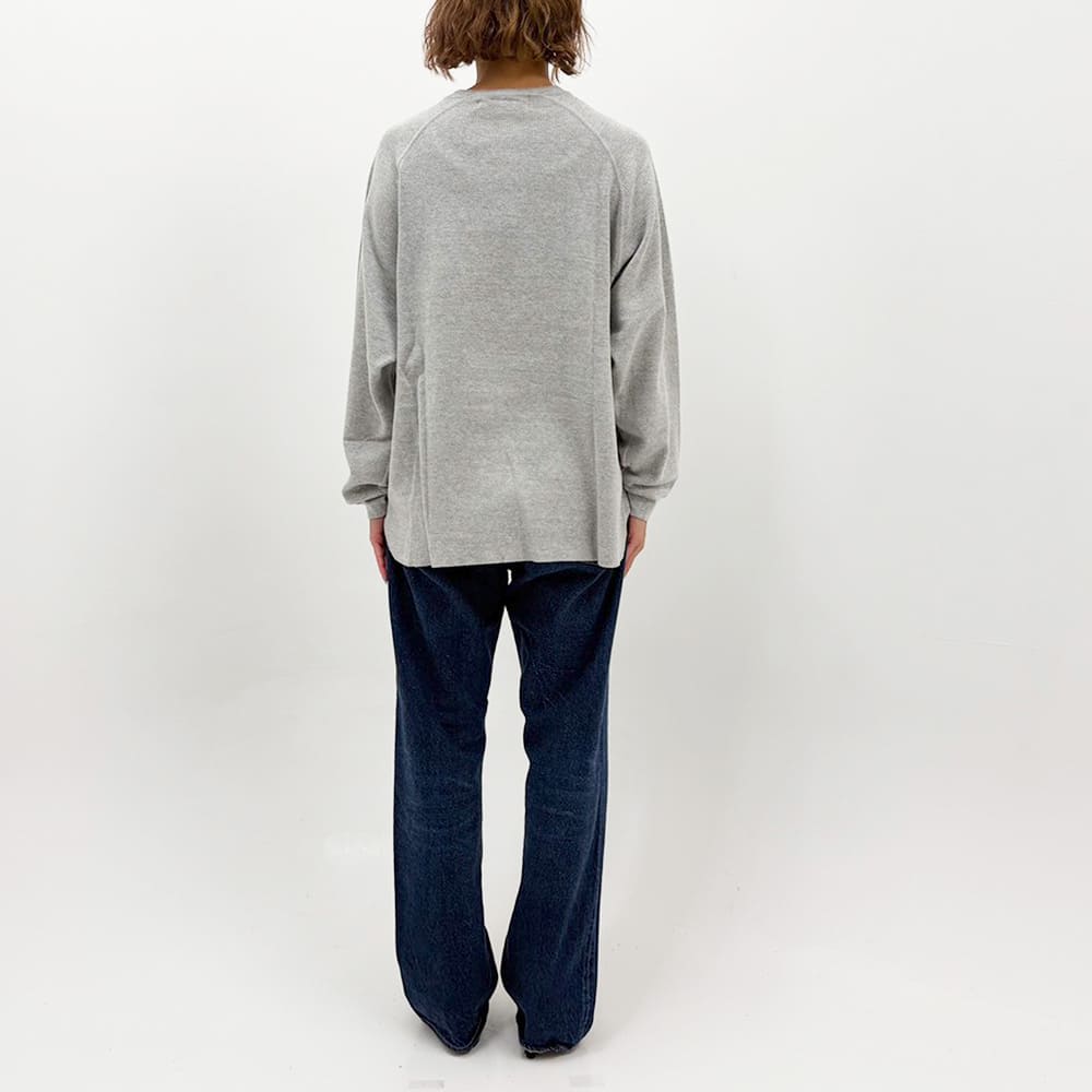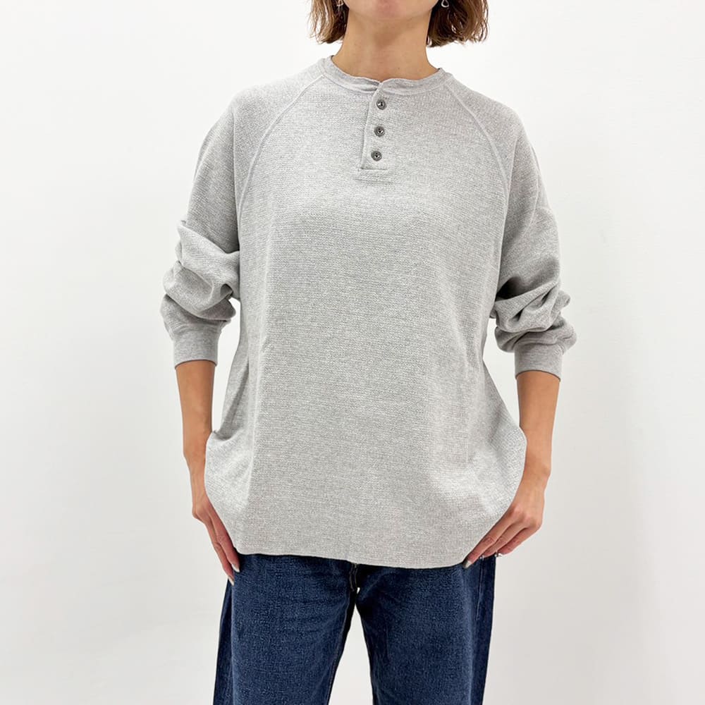素材には、ふんわりとした膨らみと優しい肌ざわりを兼ね備えたコットンワッフル生地を使用。スウェットよりも軽やかで、ロンTよりもしっかりとした存在感があり、インナーにも一枚着にも使える絶妙なバランス感です。