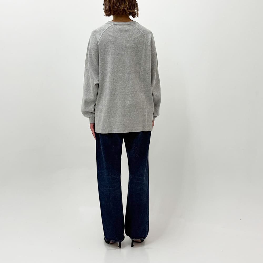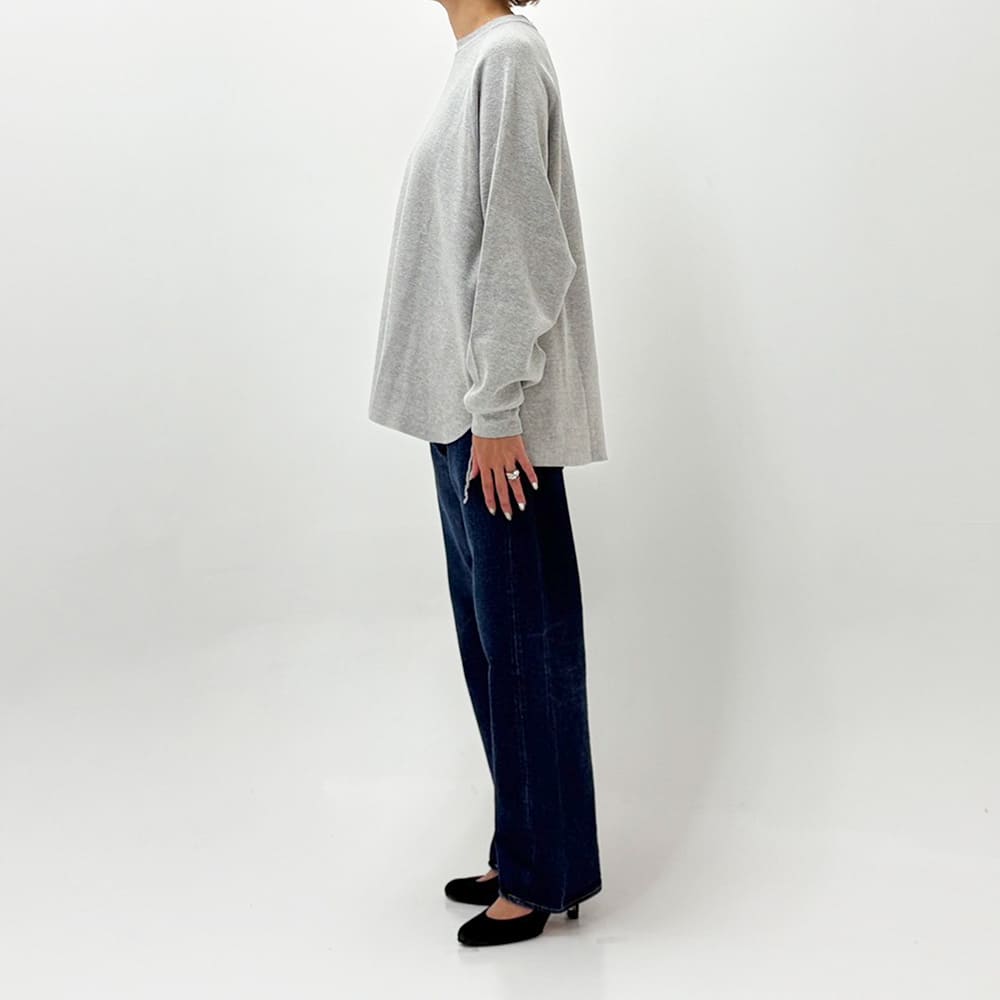素材には、ふんわりとした膨らみと優しい肌ざわりを兼ね備えたコットンワッフル生地を使用。スウェットよりも軽やかで、ロンTよりもしっかりとした存在感があり、インナーにも一枚着にも使える絶妙なバランス感です。